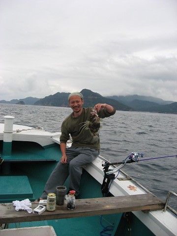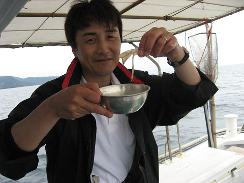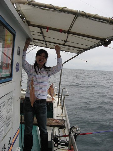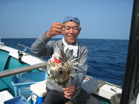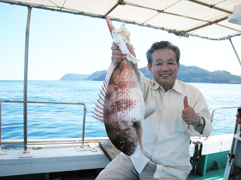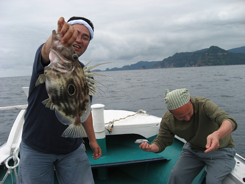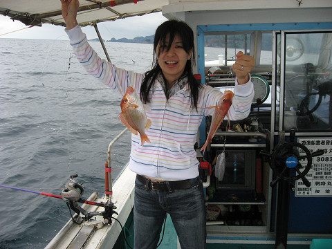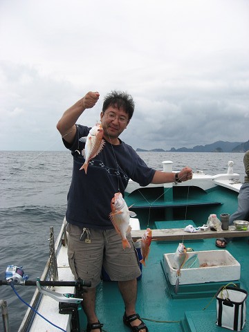 朝6時出船し、福浦御崎沖のポイントで開始。釣り始めはたちまち300M巻きのラインが無くなるほどの早潮…このままではどうかと思いましたが、10時頃には潮も適度な流れになり吉岡さんが狙いの真鯛とイサキをGET!!