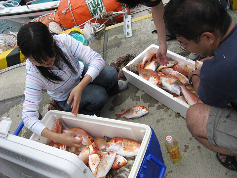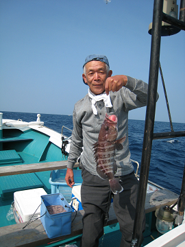 朝6時出船し、午前11時までに二人でレンコ鯛を20キロ程釣り、吉岡さんはマハタやマトウ鯛などのおまけも付いて大満足での帰港となりました^ |