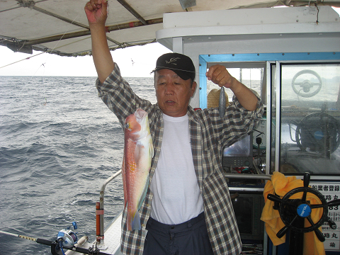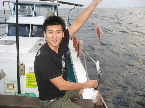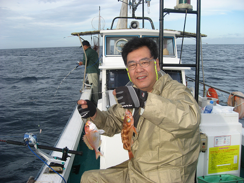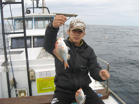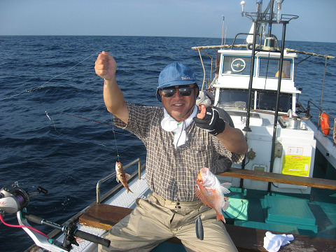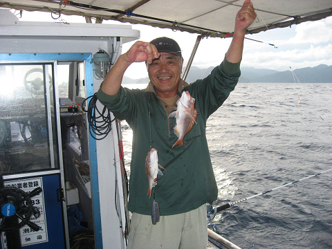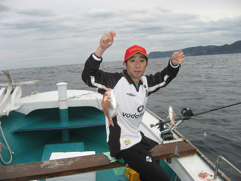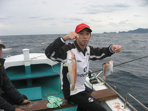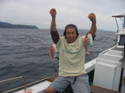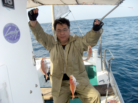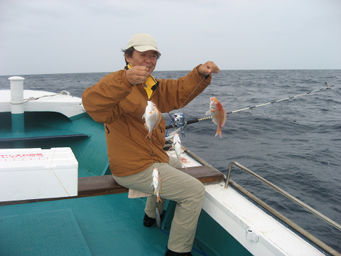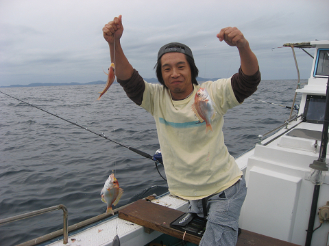 一人はすぐにダウン!二人はよく釣れるレンコ鯛に夢中!