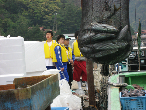 無理をせず湾内へ戻っての釣り体験をし、地元の定置網大漁の水揚見学をしました。
