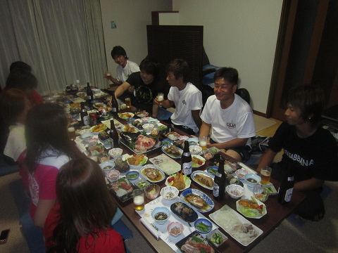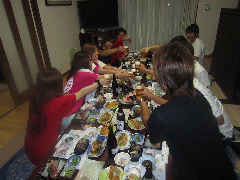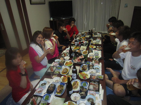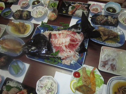 宿へ帰ってから釣りたて白イカ・石鯛も加わった海の幸でカンパ〜イ♪