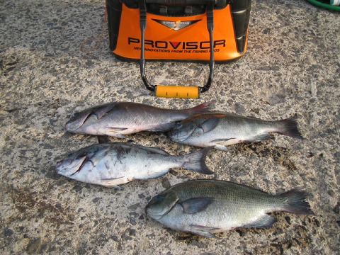 隠岐の島町 脇田さんら2名様 朝から東からの大きなウネリがまわり上がれる磯も限られてしまい久見の馬背へ向かいましたが 先端は完全に波がかぶっている状態・・・ 立島寄りに渡磯して頑張りましたがさらにウネリが大きくなってしまいとても釣り辛い中頑張りました。 真鯛45センチクラス、30センチクラス、カナなど