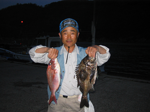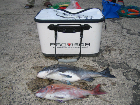 今日は最悪の潮…代の黒島に移って夕方最後の1時間切った頃、餌が初めて付いて上がってきて、これはもしかすると!?って感じになり、次の1投で尾長・その次の1投で真鯛でした。