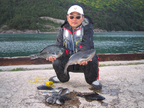 福浦御崎 昨晩から歩きで向かった従弟と連れの方、朝マヅメに尾長43cm・口太40cmUP・他30cmクラス多枚。 |