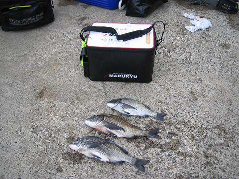 しっかり良型のチヌGET!!流石名人だね〜 しかし雨には弱い名人、雨&強風で2時間早くギブアップ^^
