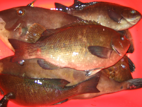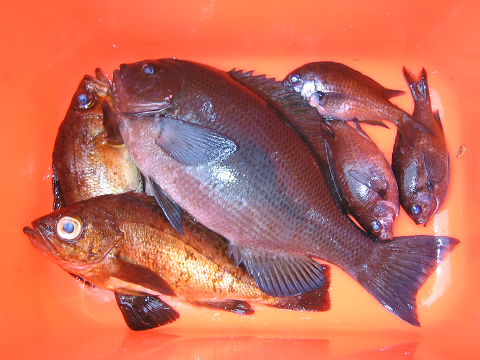 先週上がった時は一日ががりでベラ1匹と木っ端グレを2匹だけでしたが、今日は一変!朝開始後すぐにヒラマサらしき大物の洗礼でラインブレーク(>_<)狙いのグレの活性も高く1ヒロで昼頃まで釣れ続けたそうです。昼からは食いも落ちたようですがグレ多数の上等釣果!