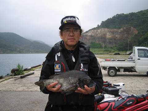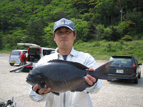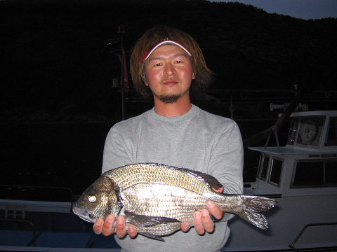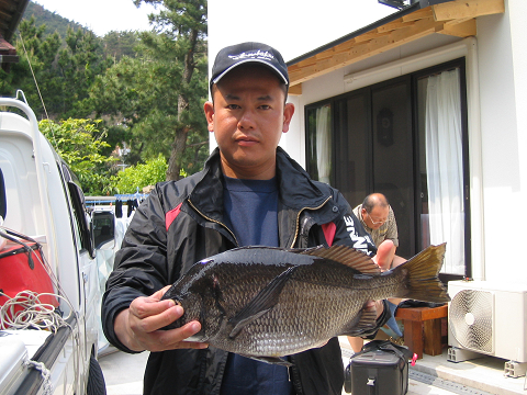 初日は平島で潮止まり・赤潮発生の悪条件の中、チヌは出ませんでしたが良型の尾長グレを釣り上げました。