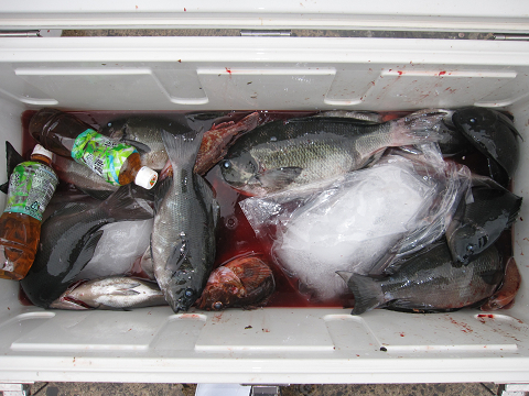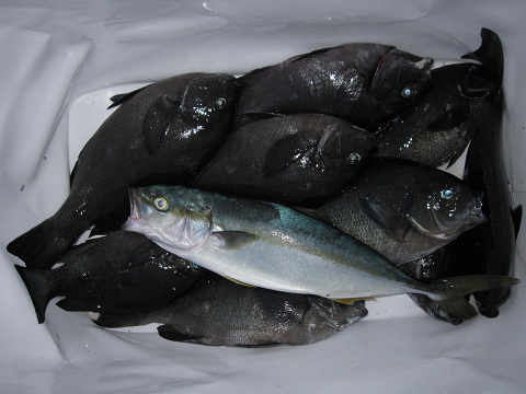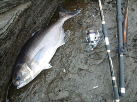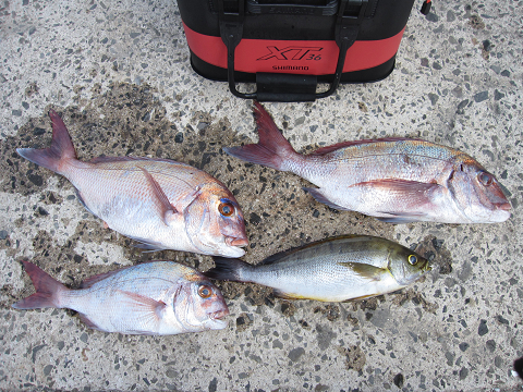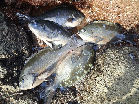 上物狙いは中型〜大型グレがわんさか見えてるし、メダイが群れでチョロチョロしてるし、青物の大型らしきがバシャバシャやってるしで魚が居るに食わない状況のまま竿納を迎えてしまいました。