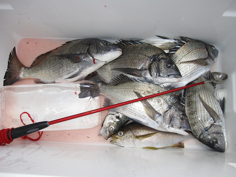 開始するとルアーにスズキ・マゴチ・サゴシなどがヒット♪コマセ釣りにはグレが多数ヒット♪そしてお昼、竿納間際の最後の一投!ジグにヒットしたのは大鯛!!充分楽しみながらやりとりして無事キャッチ♪