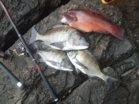 大本命のグレは時期的にさすがに厳しい中、どの磯も真鯛がヒットするも獲れたのは食べ頃サイズで大鯛には全部切られてしまいました。