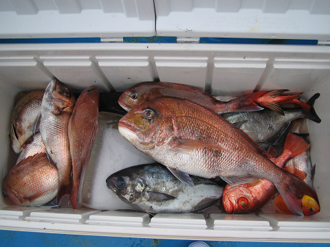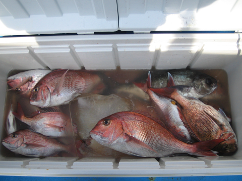 連休中は、ほとんど時化模様でしたので久々の沖釣りです。ノッコミの真鯛狙いで向かいましたが、朝のうちはほとんど潮が動かず1時間以上反応がありません…そのうち灘に向かう潮が動きだし、ぽつぽつヒットして来ますが、次第に潮が早くなり過ぎ厳しい状況に…型は良型が混じりましたが、数が伸びません。しかし、ほとんどが腹パンパンでしたね〜