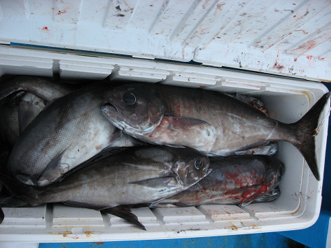 ポツリ、ポツリ、拾い釣りで何とか150Lクーラーも埋まった頃、いよいよ魚探の反応も無くなった午後3時竿納とした。