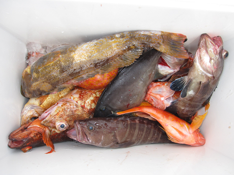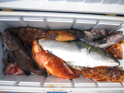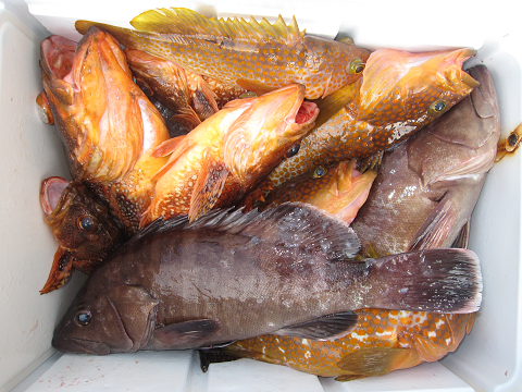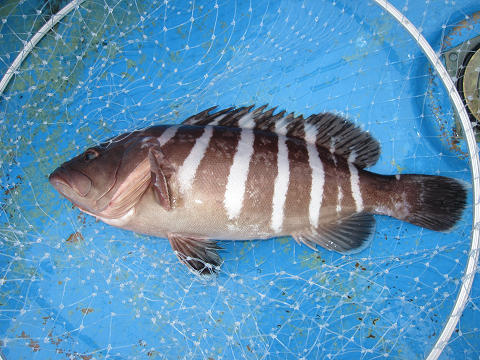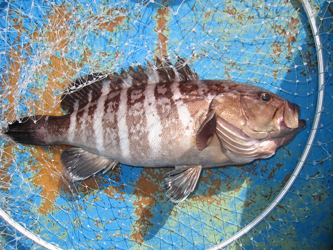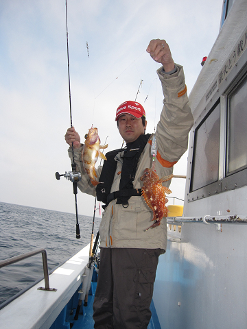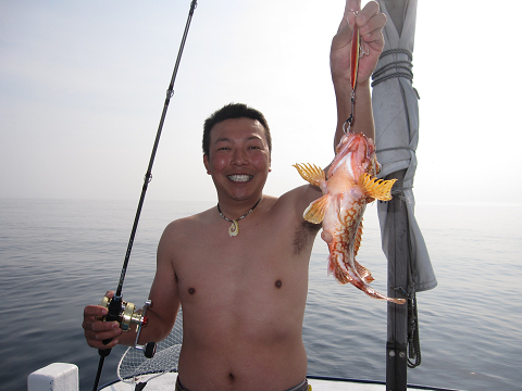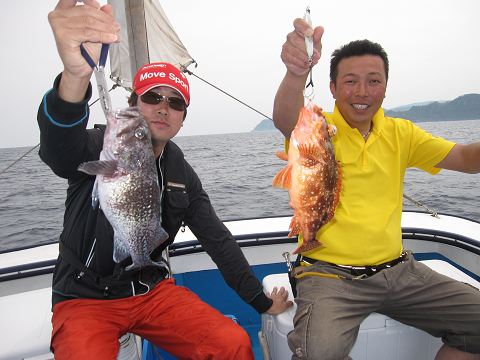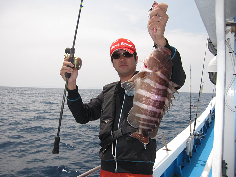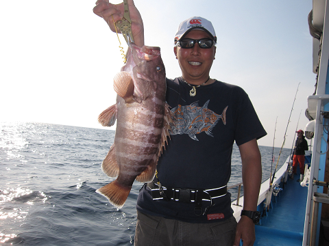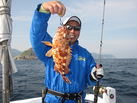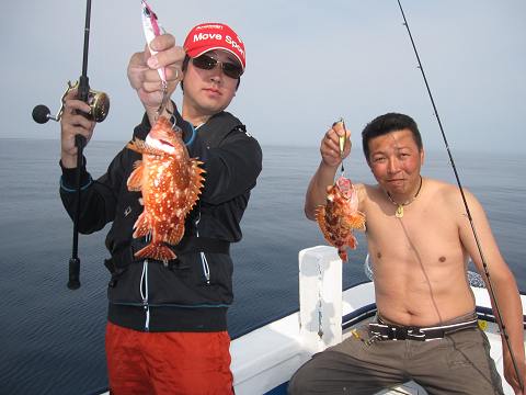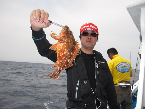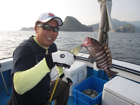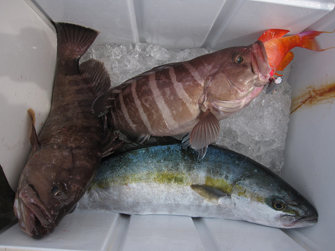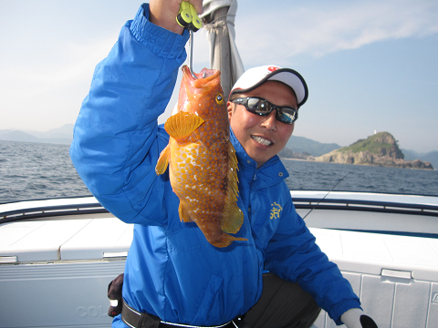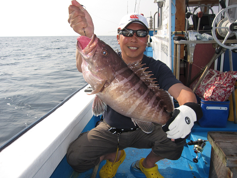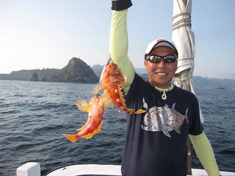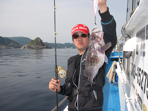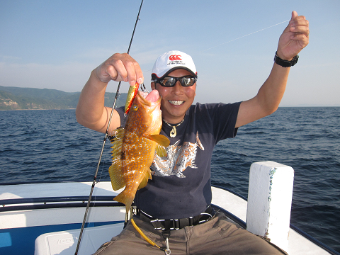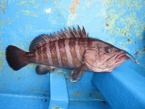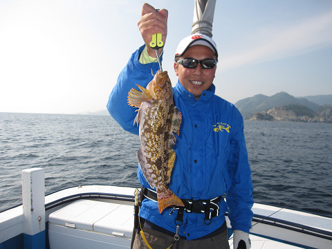 朝間の時合いは終わり静かな海面になって、根魚ジギングに切り替えるとやはり釣れる♪ガシラをピンポイントで狙えばなんぼでも釣れますが、十分釣ったところで「今度はマハタ・アコウでもやりましょうか?」「ハイッ♪」ポイントを大きく変えハタ類を狙うことに。