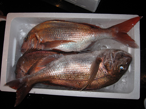 大量のベイト反応に出会いインチク+枝針仕様の道具を下せば真鯛3枚パーフェクト♪早潮に苦労しましたがなんとか少しは漁になったところで13時半竿納としました。