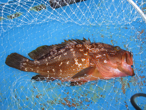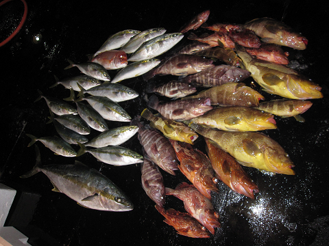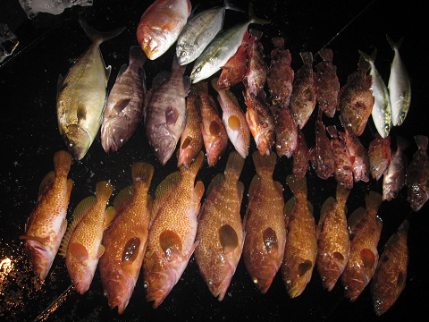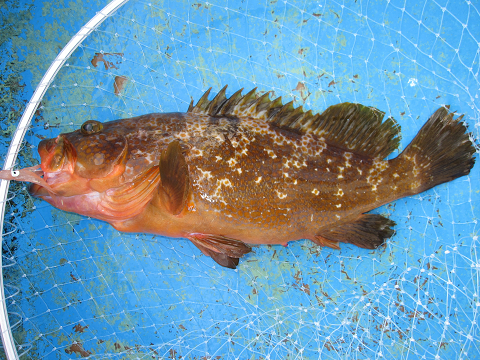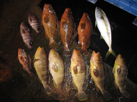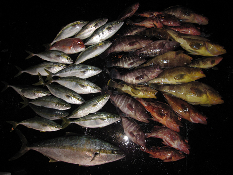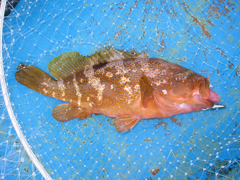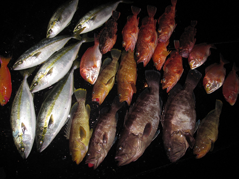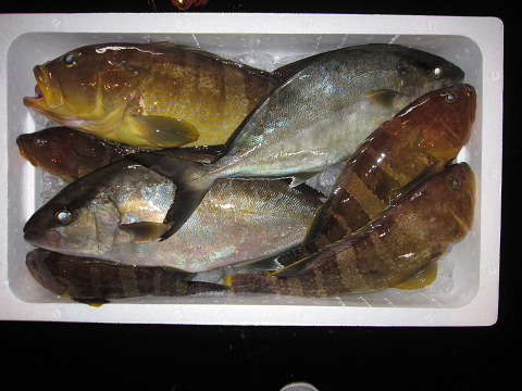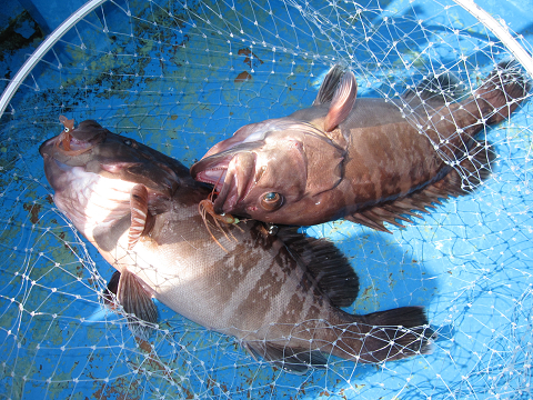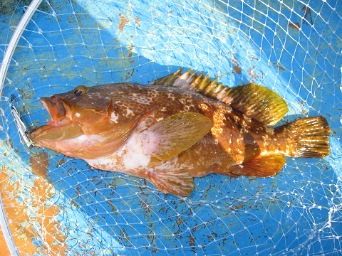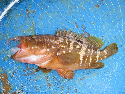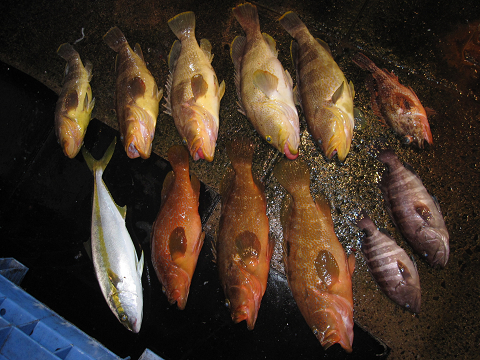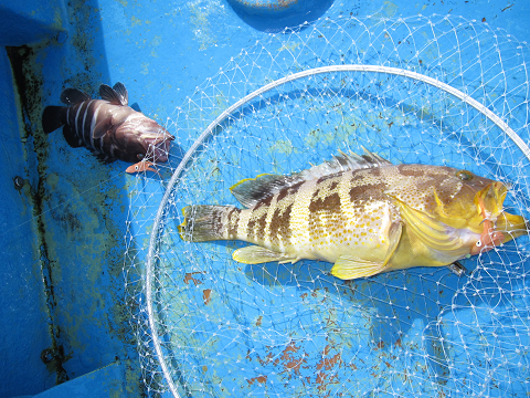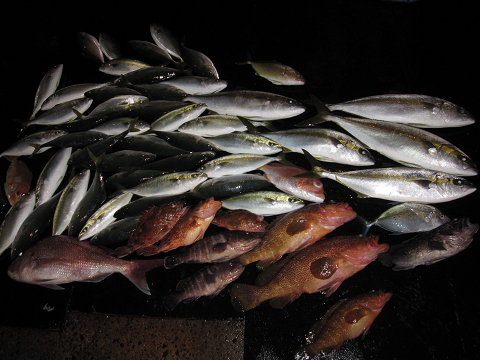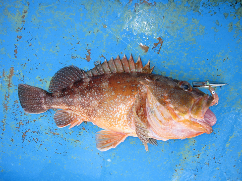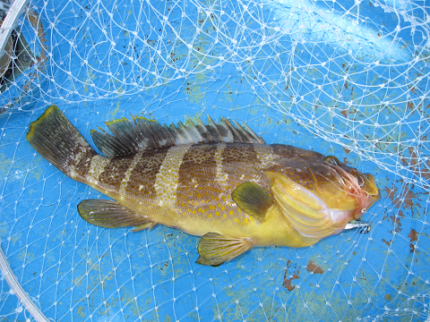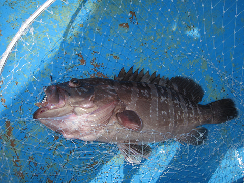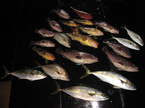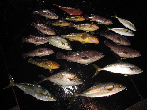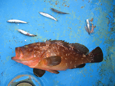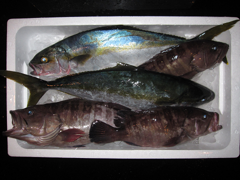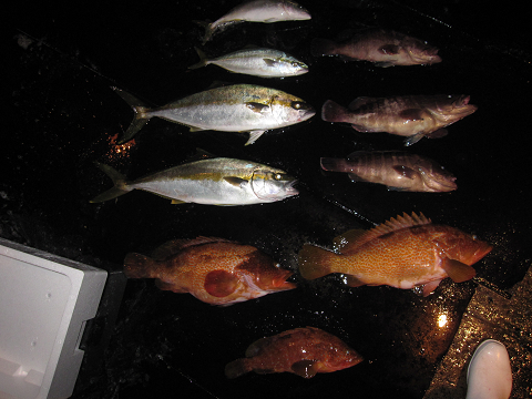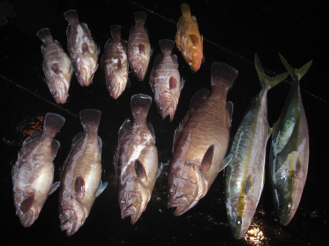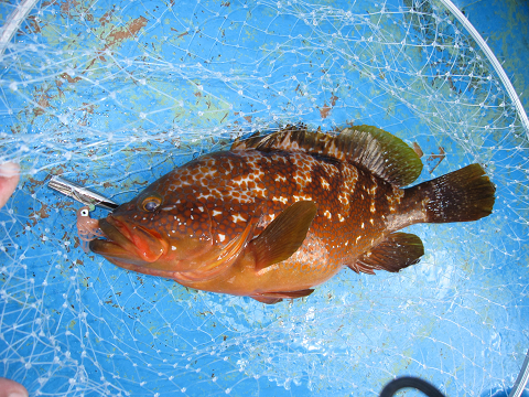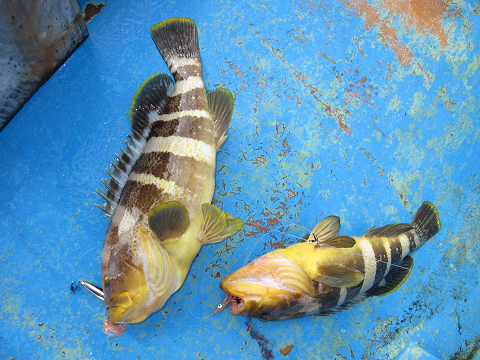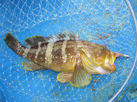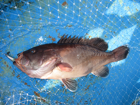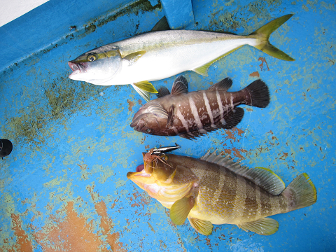 様子見に近場のヒラマサからやって見ると2キロ級の子マサが食ったが、数が少なく後が続かないので相手に出来ず根魚狙いに!