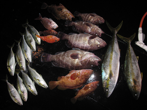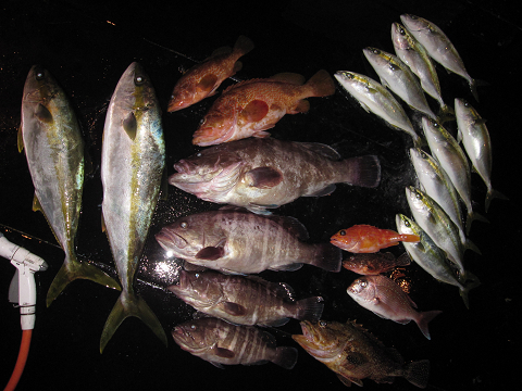 本日も夜中から吹き続く10m級の西風は朝になってもおさまらず、ショアジギングの渡船のお客さんに「渡礁出来ても9時や10時になるかもよ〜!」と伝え、またの機会にしていただき風が少し落ち着くのを待ってからゆっくりと一本釣り漁へ向かいました。