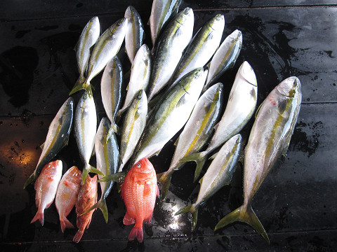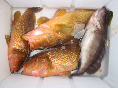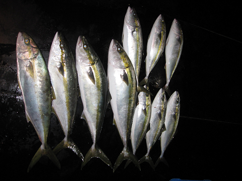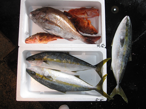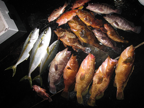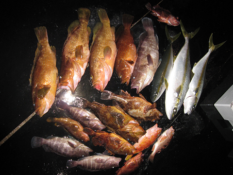 早朝から10時までこの辺りの魚を狙いましたが、ヒラマサは豆〜2.5キロ級3本・アコウ・マハタを追加したところで野鳥調査が終了したようで帰港。