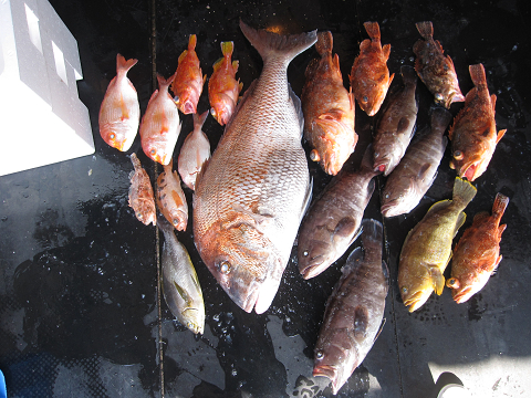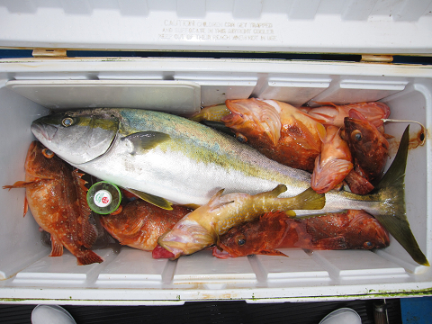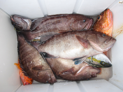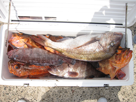 今日も大物バラシが数回ありましたが最後に真鯛を釣り上げ時間切れ、特にこの真鯛の前にヒットした大物は必死で底を切り何度も竿をのされつつもあと20mまで巻き上げたところで残念ながらフックオフ…そんな悔しいバラシもありましたが、終わって見れば大型クーラー満タン♪大漁で今回の高級根魚釣行を終えました。