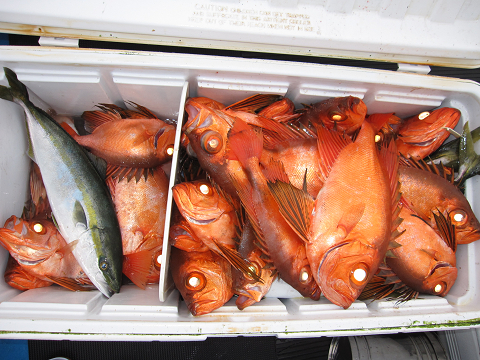 そうなればやはり高値安定の高級根魚です!キンメ・抱卵カサゴ・ハタ主体に狙い、ヒラメ・真鯛などのゲスト混じりました。