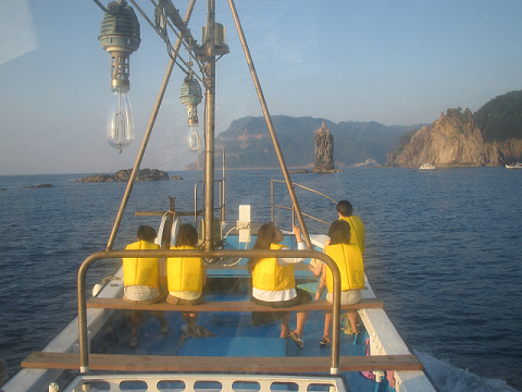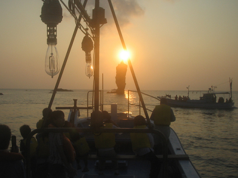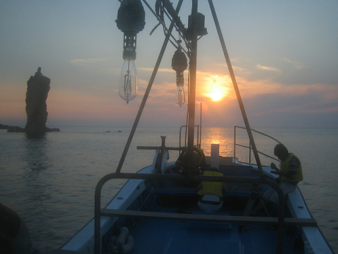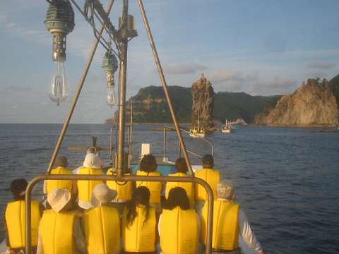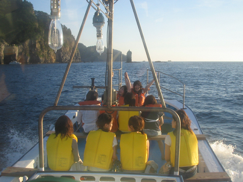 昨日は南西の強い風で各遊漁船とも船はいくらでも出せるんですがしぶきなどがかかる可能性が大で気の毒で断りました…今日は昨日行けなかったお客さんもどうしても見たいと言う事でたくさん残っておられましたので時化模様がまだ変わらず続いておりましたがしぶきなど一応覚悟していただき各遊漁船も出航しました。お客さんにしぶきがかからないように各遊漁船とも気を配らせながら走らせお客さんが濡れる事なく寄航しました(^^)