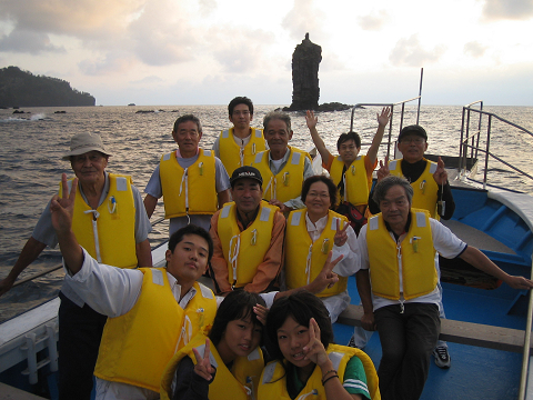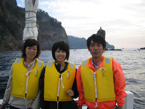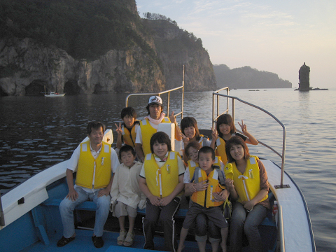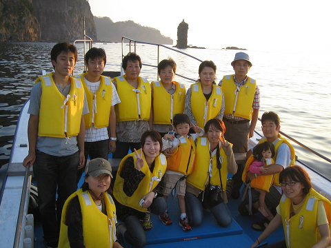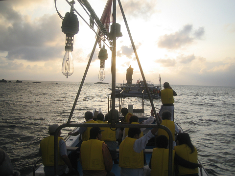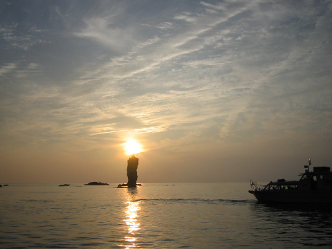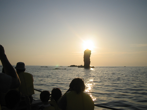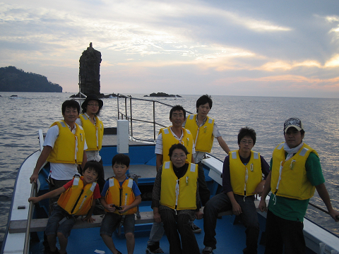 今日は山田地区の皆さん40数名、他数名を潮路丸・第五潮路丸・清光丸・しゃくなげの4隻にて出発!夕日が雲から見え隠れする中、時折見事な夕日が見れて感激!地元の人でもからローソク島に夕日が灯る瞬間を見た人はそういないでしょうね〜船で行かないと見れないですから!